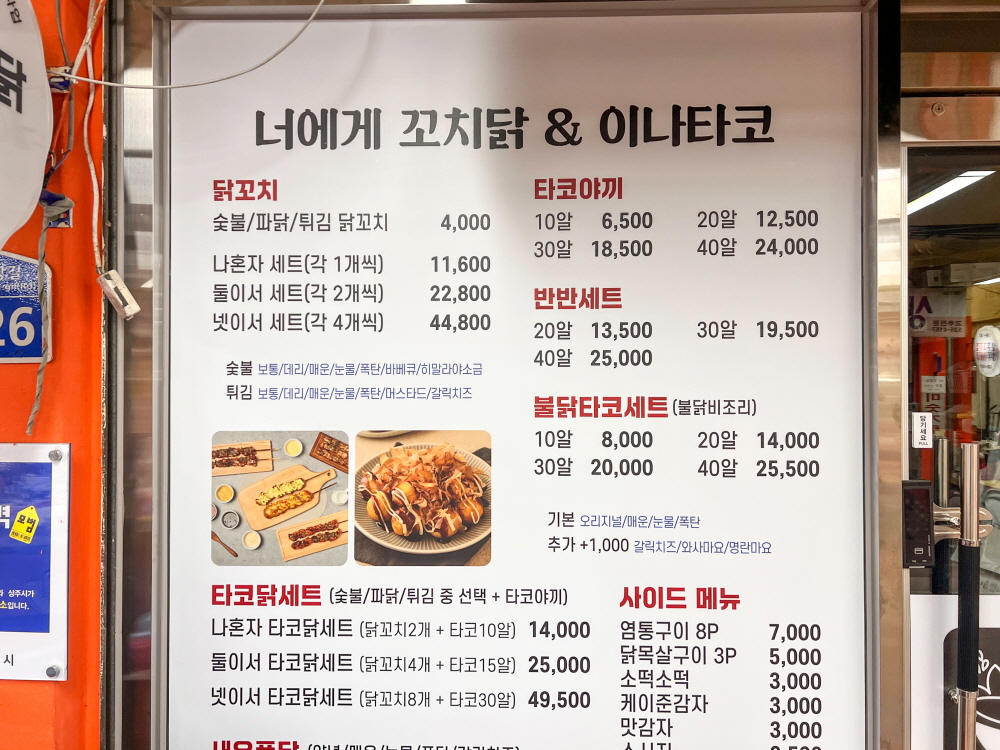 - 판매상품 닭꼬치, 타코야끼, 타코닭세트, 붉닭타코세트